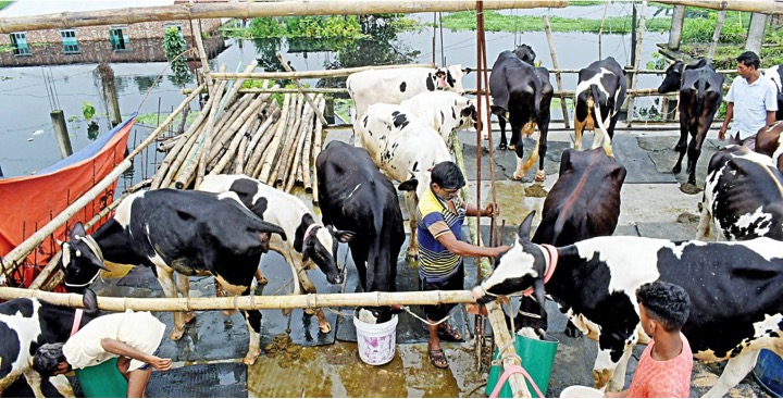 I don’t know how I would be able to recoup the losses and when everything would return to normalcy,” he told The Daily Star. Miah is not alone as thousands of farmers like him across the country received the fresh blow of flood after the coronavirus. Milking by Md Ripon and Md Rafiqul Islam in Chatmohar of Pabna, who have seven and four cows respectively, dropped 30 to 35 per cent in the last one month due to flooding.